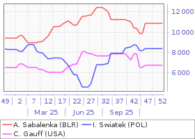 | 1 | A. Sabalenka(BLR) | 63 | 12 | 0.840 |