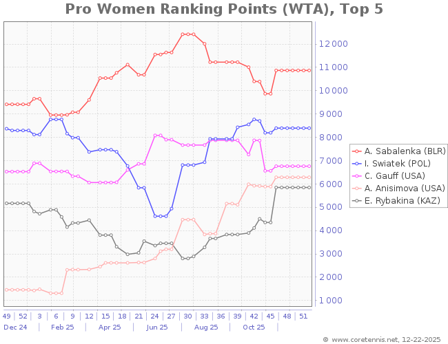 The following graph shows the top 5 players of the week and the number of points they currently hold in the rankings. Be sure to also check out our WTA Top 10 Position Graph or go straight to the WTA Top 100 Standings.
